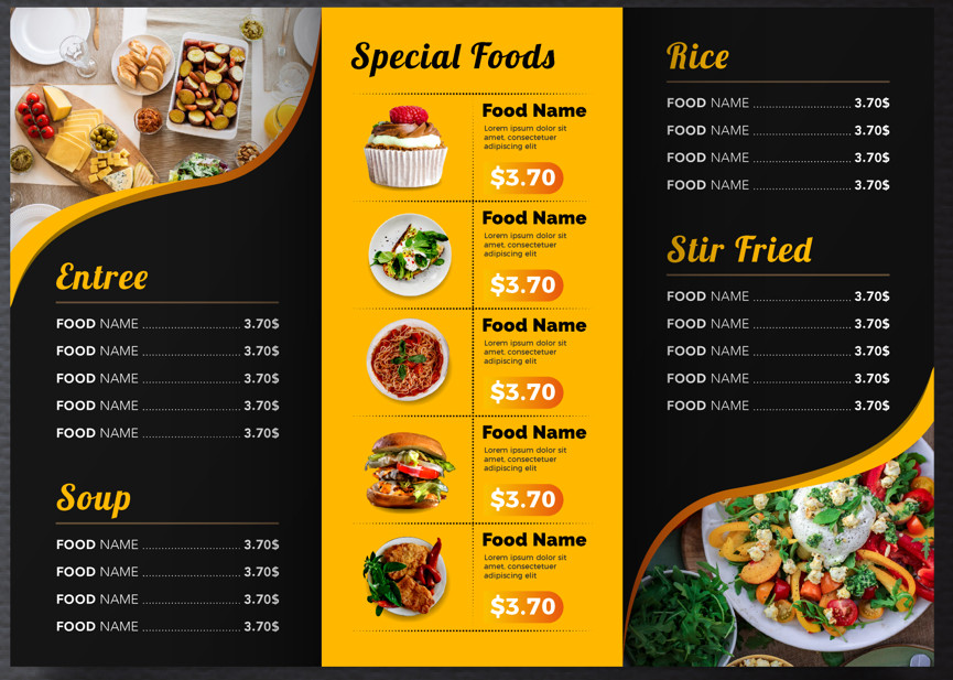 3- Menu/ thực đơn quán bán thức ăn nhanh đẹp tham khảo - màu chủ đạo vàng và đen