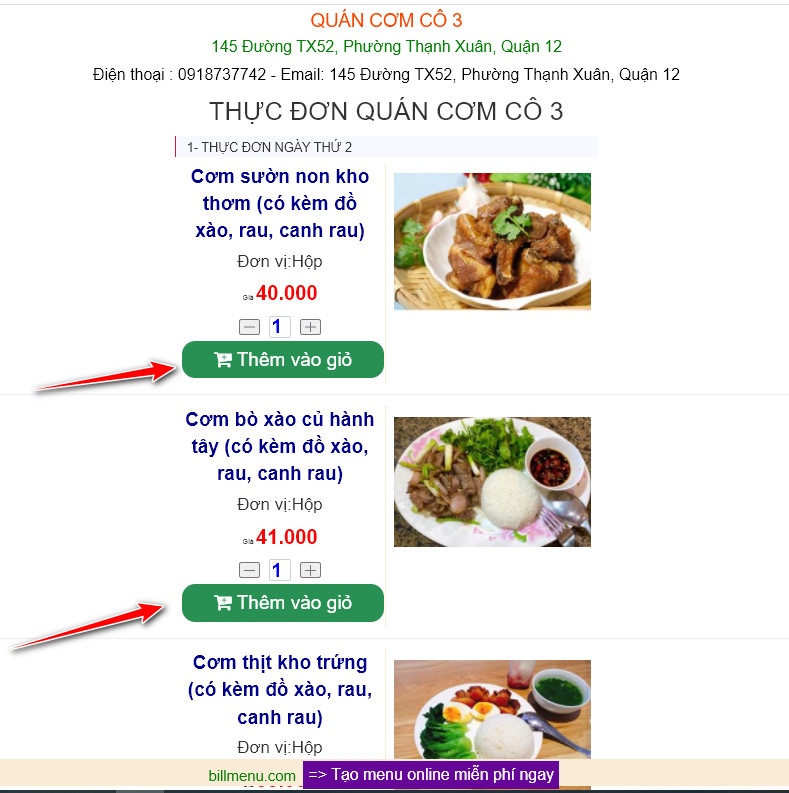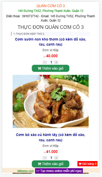 => Mẫu 1 có hình ảnh và chức năng đặt hàng trên menu: Xem mẫu menu online của quán cơm văn phòng cô 3